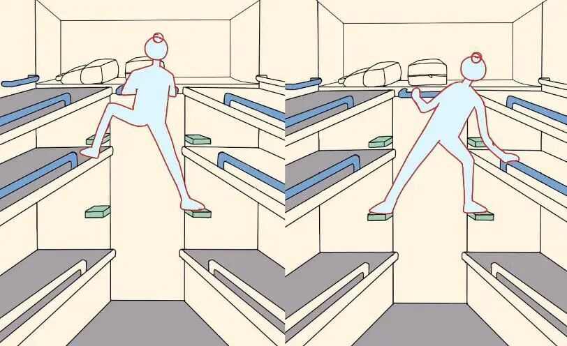 此外,记者发现,网络中有不少教程分享正确使用半包式卧铺的技巧。正确的操作方法是先将收起的脚踏板扳平,确保其与墙面垂直。在上行过程中,身体正面应朝向过道,首先用双手稳固抓住上方的扶手或护栏。接着,用脚踏实下铺的床沿,然后踏上连接下铺与中铺的踏板;随后踩稳中铺的床沿,最后登上中铺与上铺之间的踏板,借助双手的力量顺利进入上铺。下行时,按照相反的顺序进行操作,同样需要逐步进行,以确保安全。